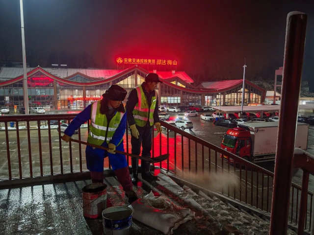 受寒潮天氣影響,1月25日夜至26日凌晨,我省沿淮淮北地區(qū)、大別山區(qū)和皖南山區(qū)溫度驟降,出現(xiàn)雨雪疊加天氣。集團相關單位迅速響應,連夜開展融冰除雪工作,奮力護航人民群眾春節(jié)回家路。截至1月26日上午9時,集團相關營運單位共計出動人員600余人次,機械設備280余臺班,撒布融雪劑600余噸。集團所轄路段路面無積雪,車輛有序通行。