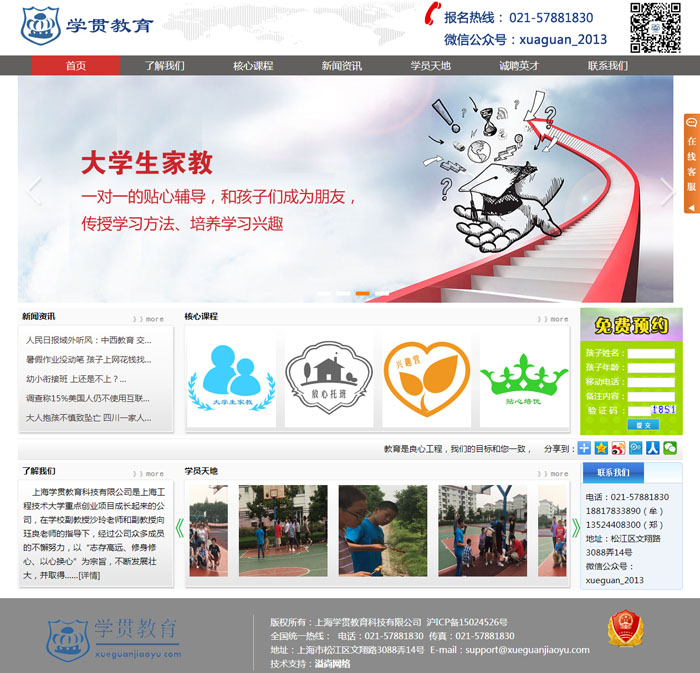上海學貫教育科技有限公司是上海工程技術大學重點創(chuàng)業(yè)項目成長起來的公司,在學校副教授沙玲老師和副教授向玨良老師的指導下,經過公司眾多成員的不懈努力,以“志存高遠、修身修心、以心換心”為宗旨,不斷發(fā)展壯大,并取得了眾多老師、家長、學生的支持和信任。