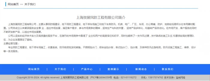 上海賀展民防工程有限公司,主要從事民防程建設(shè),地下民防工程建設(shè)、地下停車場施工和地下車庫防汛、機房、電廠、廠區(qū)、車間、辦公商鋪、防護、地勢較低易積水處專用器材配置。公司自成立以來秉承服務(wù)安全事 業(yè),適應(yīng)市場發(fā)展,滿足客戶需求,參與市場競爭的精神,堅持生產(chǎn)與科技并重, 堅持產(chǎn)品多樣化,和基礎(chǔ)產(chǎn)品自動化。在市場開發(fā),客戶服務(wù)的同時不斷研發(fā)新產(chǎn)品,以適應(yīng)市場發(fā)展需要。