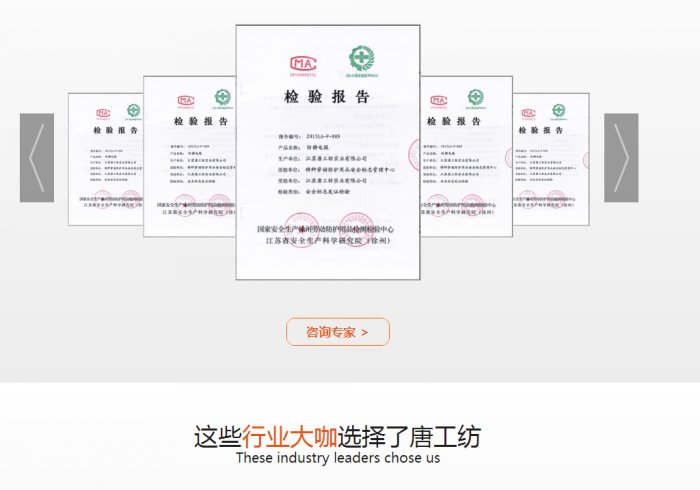 唐工紡運用國內(nèi)外先進的生產(chǎn)管理技術(shù);利用公司所建立的實驗室的設(shè)備資源;采用的Tangwear系列面料在防蟲防螨、防污防水、色牢度、耐光性、耐油污、耐氯、耐高溫隔熱、隔音降噪、耐紫外線、防靜電、阻燃隔熱、防酸堿、防電弧、防電磁輻射、防核輻射等方面,符合ISO標準、美國工裝標準、歐洲工裝標準、澳大利亞工裝標準和中國國家標準(經(jīng)BTTG、TUV、SGS、ITS、BV、IAWAT和國家勞動保護用品質(zhì)量監(jiān)督檢驗中心(北京)、國家安全生產(chǎn)北京勞動防護用品檢測檢驗中心、廣東省微生物分析檢測中心、華東國家計量測試中心等國家權(quán)威檢測機構(gòu)的嚴格檢測)。