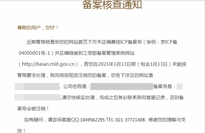 近期管局核查網(wǎng)站首頁下方是否正確懸掛ICP備案號及鏈接到工信部網(wǎng)站http://beian.miit.gov.cn,收到通知郵件請及時聯(lián)系我司,以免因未處理而注銷備案。