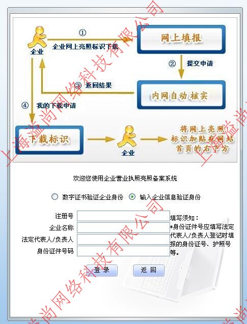 點(diǎn)擊“企業(yè)網(wǎng)上亮照標(biāo)識(shí)下載”模塊,輸入“用戶(hù)名”和“密碼”進(jìn)行登錄(首次登錄的用戶(hù)須先進(jìn)行注冊(cè)),進(jìn)入“企業(yè)營(yíng)業(yè)執(zhí)照亮照備案系統(tǒng)”頁(yè)面,輸入企業(yè)信息(企業(yè)標(biāo)識(shí)、注冊(cè)號(hào)、企業(yè)名稱(chēng)、法定代表人/負(fù)責(zé)人、證件號(hào))驗(yàn)證身份。已經(jīng)領(lǐng)取數(shù)字證書(shū)(營(yíng)業(yè)執(zhí)照電子副本)的企業(yè),可直接用數(shù)字證書(shū)驗(yàn)證企業(yè)身份。