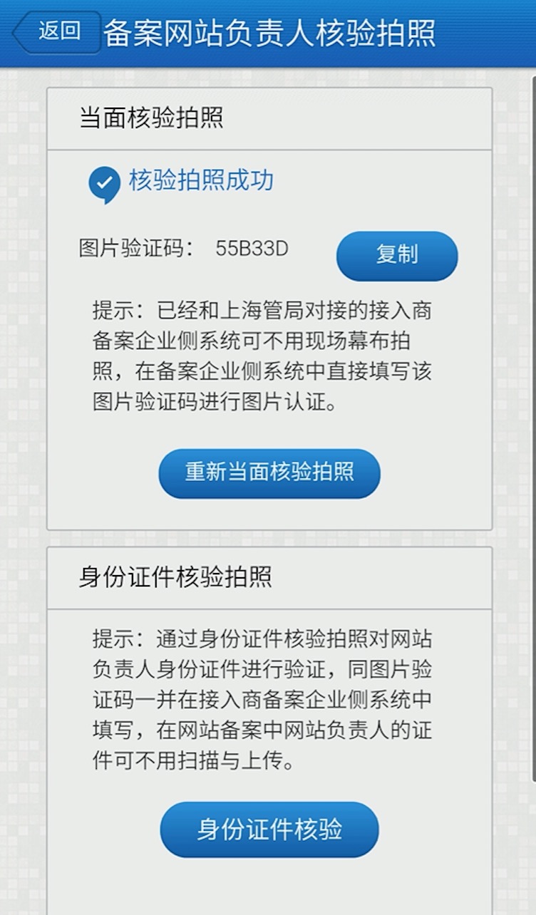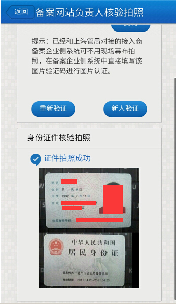 重新驗證:如果您的核驗拍照環(huán)境光線不清楚時,可以選擇重新驗證。點擊會重新進(jìn)入備案網(wǎng)站手機(jī)當(dāng)面核驗拍照,驗證成功將替換上次手機(jī)核驗拍照圖片。