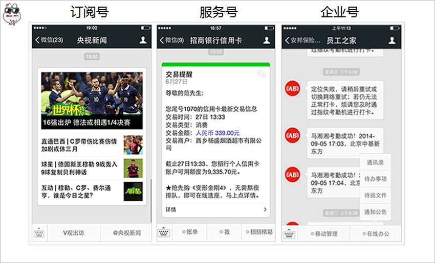 現(xiàn)在我們來看下訂閱號、服務號和企業(yè)號的頁面效果哦;